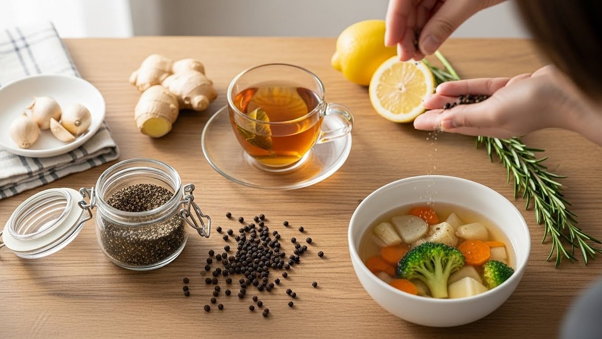 ブラックペッパーの辛み成分は末梢の血行を促す働きがあるとされています。冷えによる手足のしびれや重だるさを感じるとき、温かい料理に黒胡椒を加えると体感温度が上がることがあります。温かい飲み物やスープにひとふりするだけで、血行改善のサポートになります。