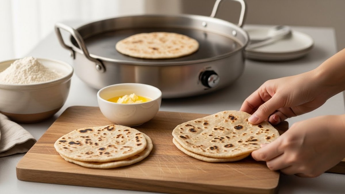 オイルを少量加えることで生地が扱いやすくなり、焼く際にバターやギーを塗って風味を足すこともあります。材料はシンプルなので、用意も片付けも楽です。
