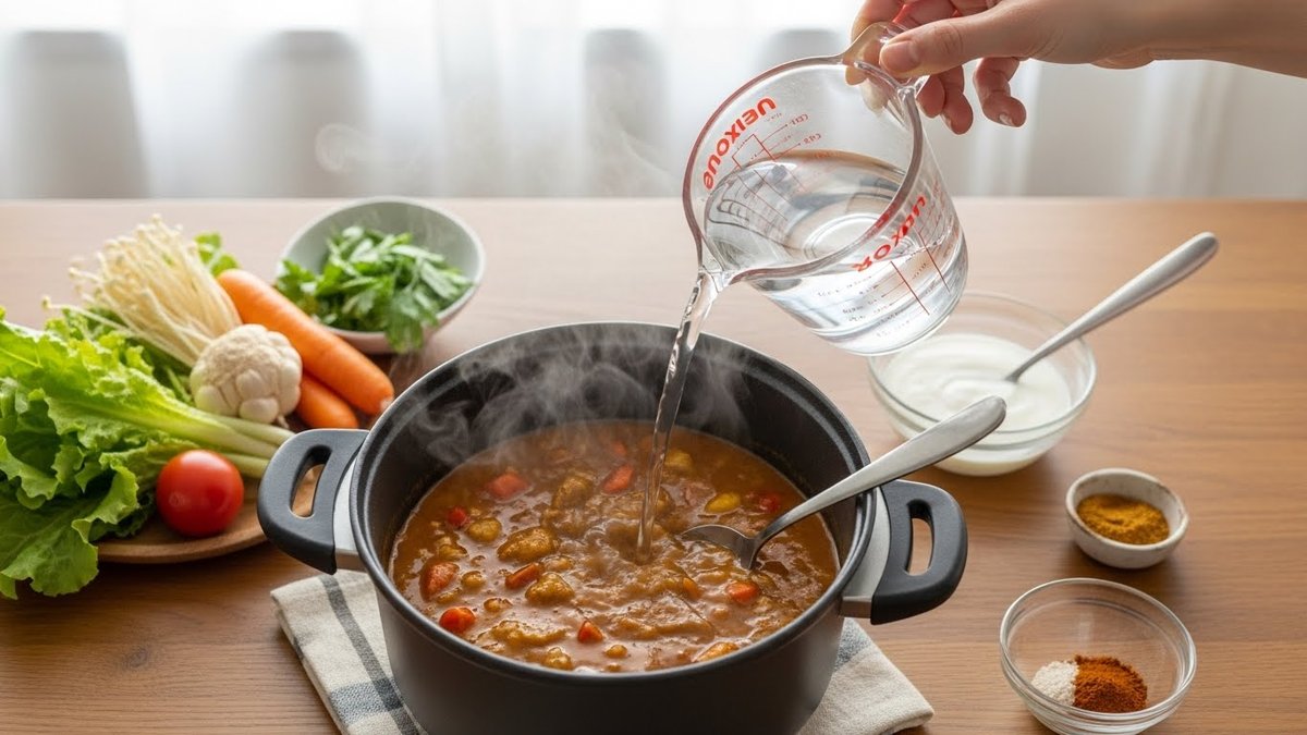 カレーが濃すぎて食べにくくなったとき、どうやって味を整えればよいか迷いますよね。水で薄めるだけでは風味が抜けたりぼんやりした味になりがちです。ここでは水や乳製品、野菜など手近な材料で旨味やコクを保ちながら程よい濃さに整える方法を、場面別の対処法や注意点とともにわかりやすく紹介します。