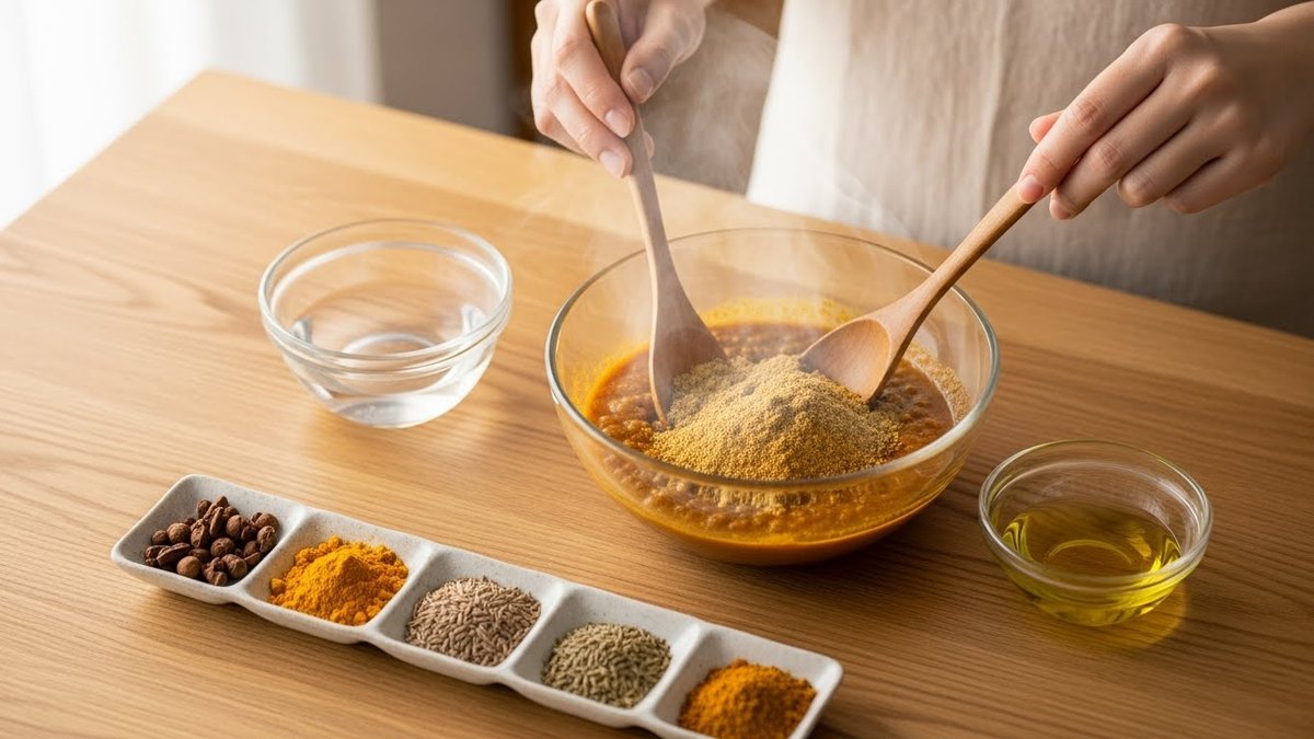 粉のスパイスはそのままだと水には溶けにくく、粉っぽく感じやすいです。小さなボウルで油またはギーと混ぜ、ペースト状にしてから鍋に加えるとムラなく馴染みます。分量はスパイスの量に対して1〜2割程度の脂が目安です。